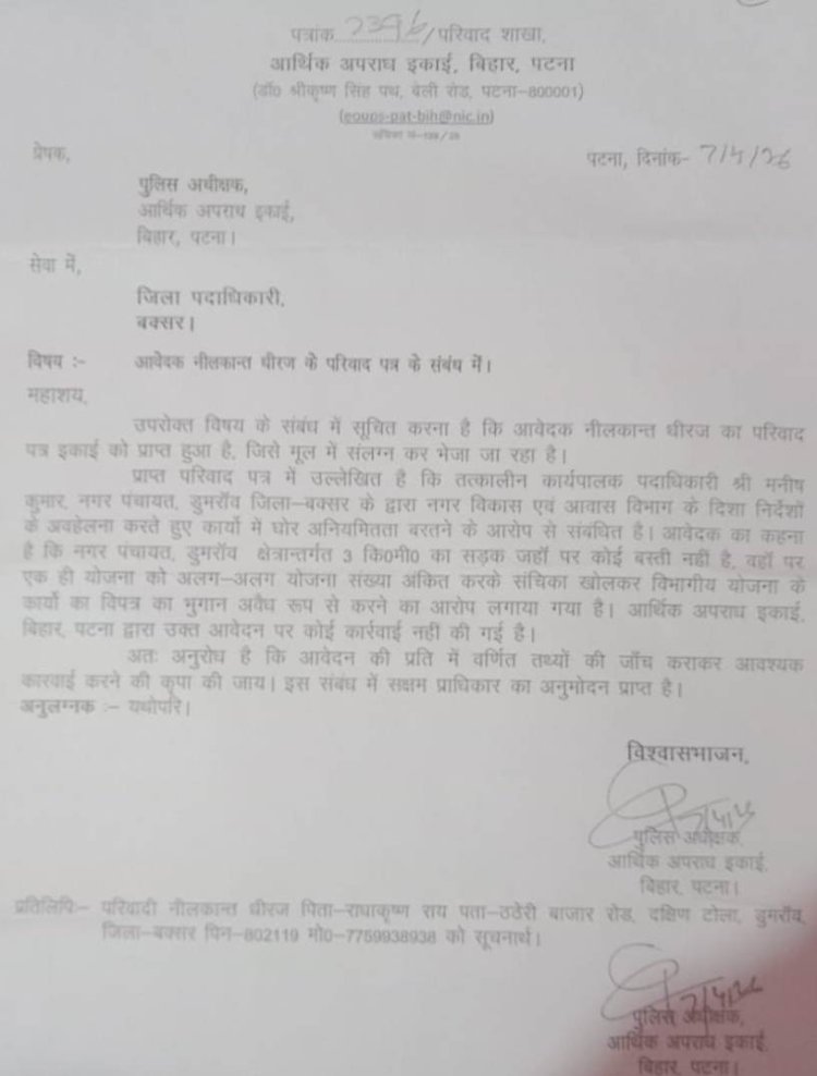 इधर, मामले की गंभीरता को देखते हुए आर्थिक अपराध इकाई, पटना के एसपी ने बक्सर जिलाधिकारी को पत्र भेजकर डुमरांव व बक्सर नगर परिषद के पूर्व ईओ मनीष कुमार पर लगे आरोपों की जांच कर आवश्यक कार्रवाई के निर्देश दिए हैं।गौरतलब है कि मनीष कुमार के कार्यकाल में नगर क्षेत्र में बड़े पैमाने पर विकास कार्य कराए गए थे, लेकिन अब उन्हीं कार्यों पर भ्रष्टाचार के आरोपों ने तूल पकड़ लिया है। आर्थिक अपराध इकाई की एंट्री के बाद मामले ने नया मोड़ ले लिया है और स्थानीय लोगों में आक्रोश के साथ शीघ्र निष्पक्ष जांच की मांग तेज हो गई है।
