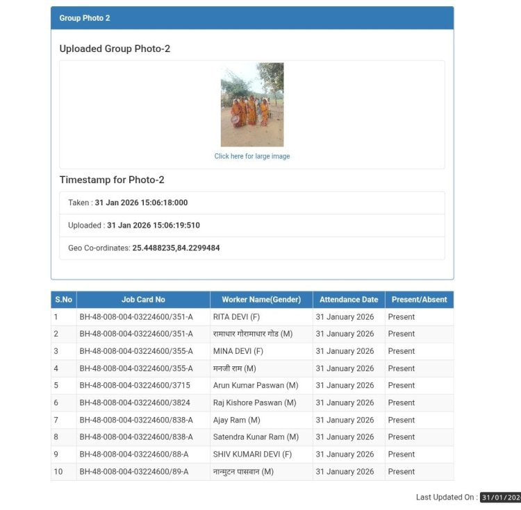 हैरानी की बात यह है कि भौतिक मास्टर रोल में स्पष्ट रूप से 7 पुरुष और 3 महिला मजदूरों की ही उपस्थिति दर्ज है, जबकि ऑनलाइन पोर्टल पर एक पुरुष मजदूर के स्थान पर महिला मजदूर की तस्वीर लगाकर फर्जी उपस्थिति दर्शाई गई है। इससे यह स्पष्ट होता है कि उपस्थिति दर्ज करने और फोटो अपलोड करने की प्रक्रिया में जानबूझकर हेराफेरी की गई है।प्रखंड क्षेत्र में लगातार सामने आ रहे ऐसे मामलों से मनरेगा की पारदर्शिता पर सवाल खड़े हो रहे हैं।